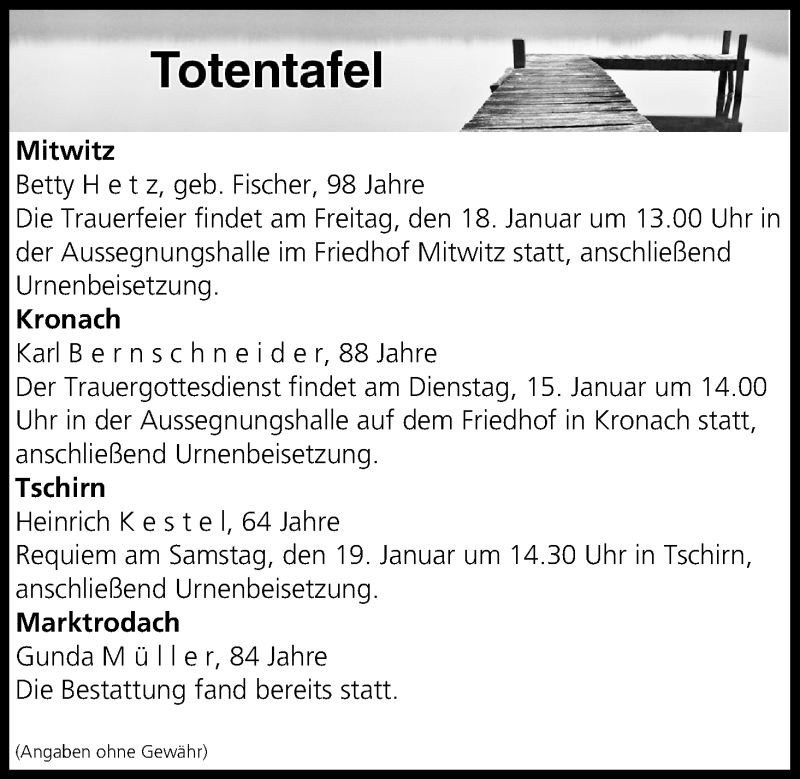 Hier finden Sie alle Traueranzeigen aus der Zeitung, die bisher für Totentafel vom 15.01.2019 erschienen sind. Weitere Traueranzeigen, die in der Zeitung erscheinen, werden hier ebenfalls aufgelistet