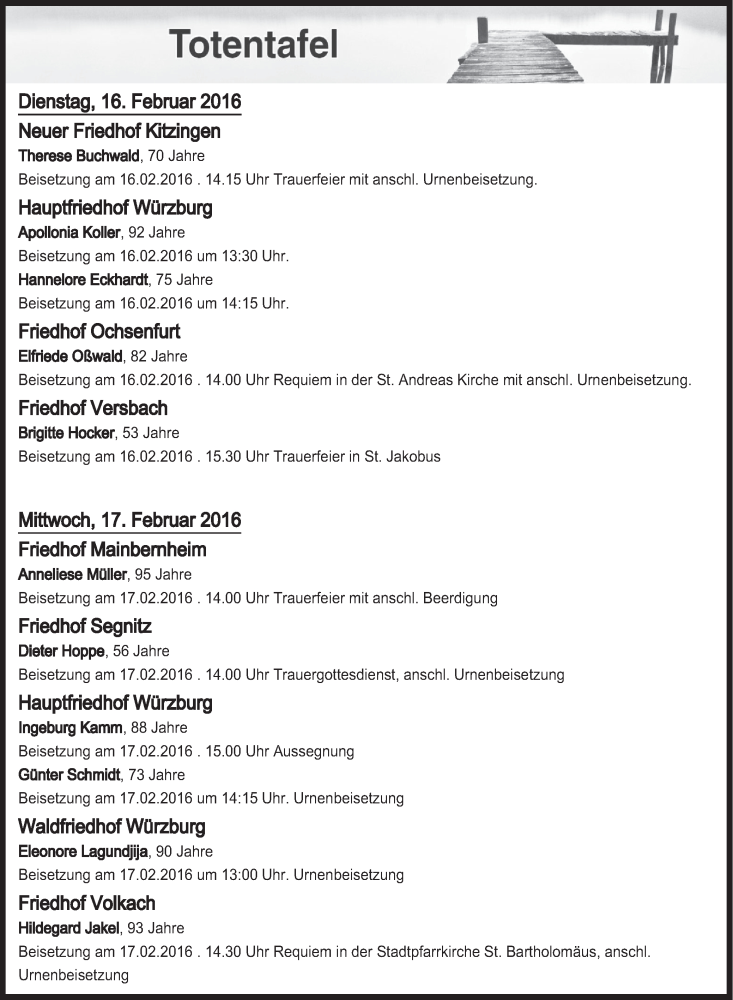 Hier finden Sie alle Traueranzeigen aus der Zeitung, die bisher für Totentafel vom 16.02.2016 erschienen sind. Weitere Traueranzeigen, die in der Zeitung erscheinen, werden hier ebenfalls aufgelistet