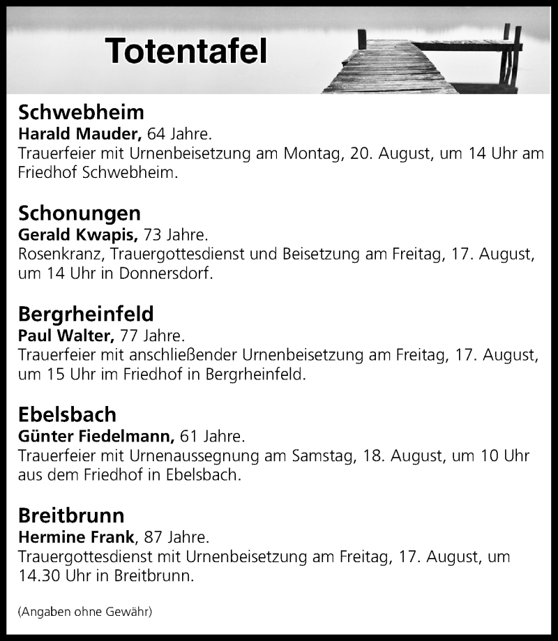 Hier finden Sie alle Traueranzeigen aus der Zeitung, die bisher für Totentafel vom 17.08.2018 erschienen sind. Weitere Traueranzeigen, die in der Zeitung erscheinen, werden hier ebenfalls aufgelistet