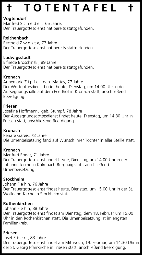 Hier finden Sie alle Traueranzeigen aus der Zeitung, die bisher für Totentafel vom 18.02.2014 erschienen sind. Weitere Traueranzeigen, die in der Zeitung erscheinen, werden hier ebenfalls aufgelistet