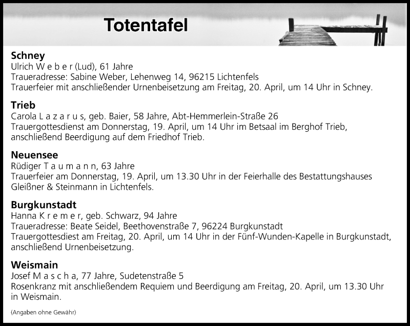 Hier finden Sie alle Traueranzeigen aus der Zeitung, die bisher für Totentafel vom 18.04.2018 erschienen sind. Weitere Traueranzeigen, die in der Zeitung erscheinen, werden hier ebenfalls aufgelistet