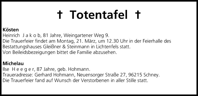 Hier finden Sie alle Traueranzeigen aus der Zeitung, die bisher für Totentafel vom 19.03.2016 erschienen sind. Weitere Traueranzeigen, die in der Zeitung erscheinen, werden hier ebenfalls aufgelistet