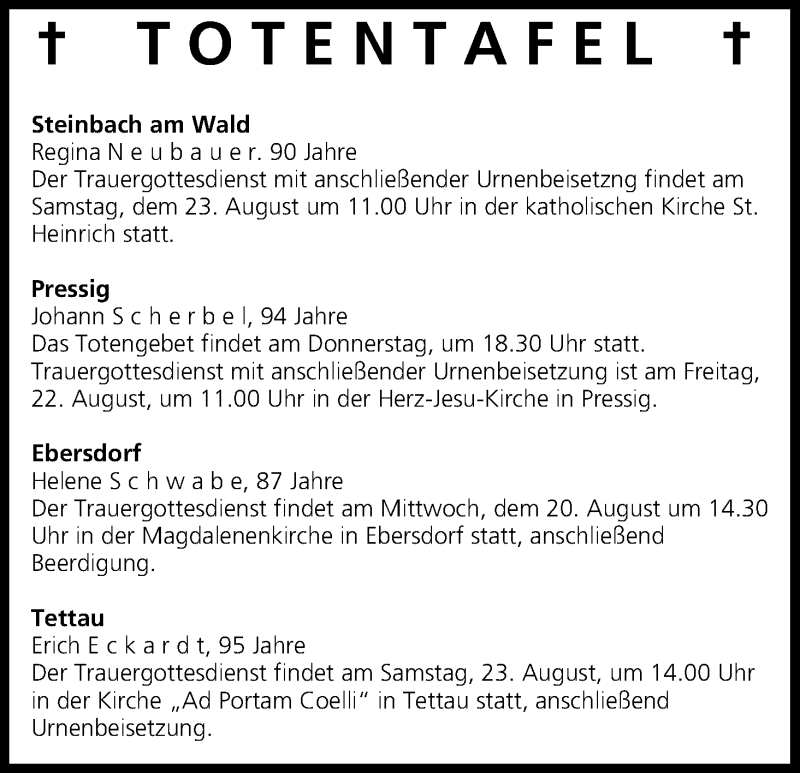 Hier finden Sie alle Traueranzeigen aus der Zeitung, die bisher für Totentafel vom 20.08.2014 erschienen sind. Weitere Traueranzeigen, die in der Zeitung erscheinen, werden hier ebenfalls aufgelistet