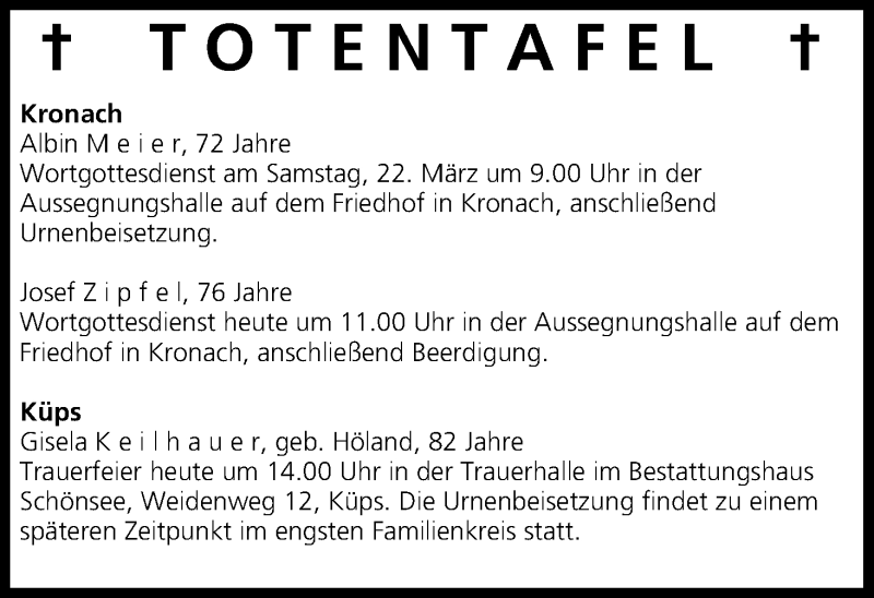 Hier finden Sie alle Traueranzeigen aus der Zeitung, die bisher für Totentafel vom 21.03.2014 erschienen sind. Weitere Traueranzeigen, die in der Zeitung erscheinen, werden hier ebenfalls aufgelistet