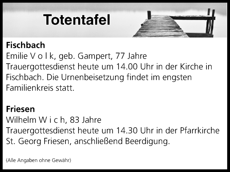 Hier finden Sie alle Traueranzeigen aus der Zeitung, die bisher für Totentafel vom 22.09.2017 erschienen sind. Weitere Traueranzeigen, die in der Zeitung erscheinen, werden hier ebenfalls aufgelistet