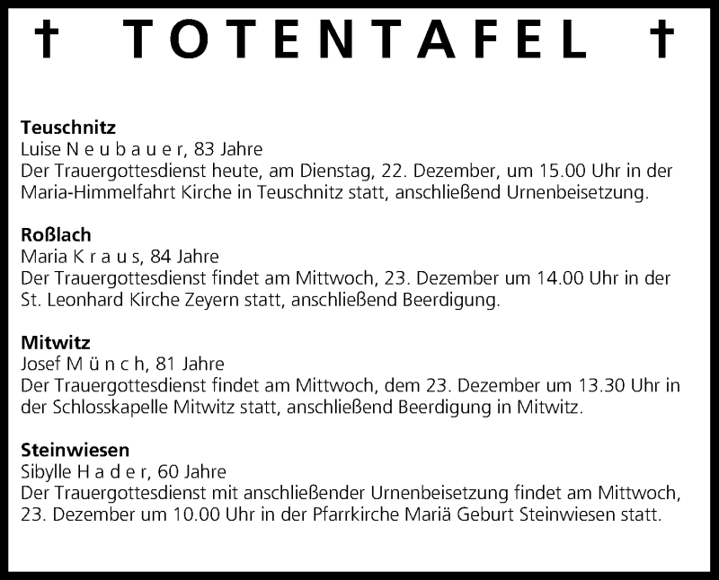 Hier finden Sie alle Traueranzeigen aus der Zeitung, die bisher für Totentafel vom 22.12.2015 erschienen sind. Weitere Traueranzeigen, die in der Zeitung erscheinen, werden hier ebenfalls aufgelistet