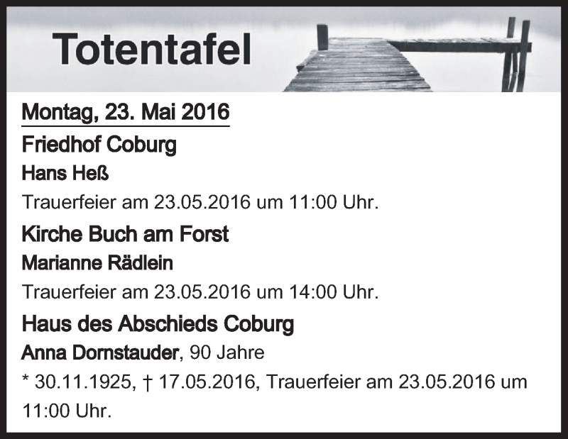 Hier finden Sie alle Traueranzeigen aus der Zeitung, die bisher für Totentafel vom 23.05.2016 erschienen sind. Weitere Traueranzeigen, die in der Zeitung erscheinen, werden hier ebenfalls aufgelistet