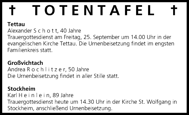 Hier finden Sie alle Traueranzeigen aus der Zeitung, die bisher für Totentafel vom 23.09.2015 erschienen sind. Weitere Traueranzeigen, die in der Zeitung erscheinen, werden hier ebenfalls aufgelistet