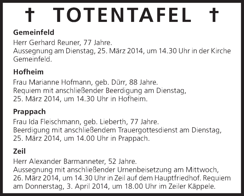 Hier finden Sie alle Traueranzeigen aus der Zeitung, die bisher für Totentafel vom 25.03.2014 erschienen sind. Weitere Traueranzeigen, die in der Zeitung erscheinen, werden hier ebenfalls aufgelistet