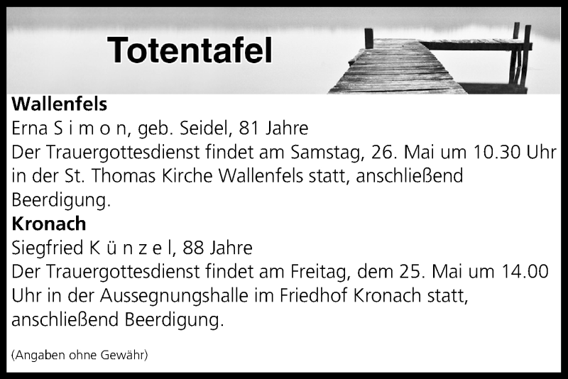 Hier finden Sie alle Traueranzeigen aus der Zeitung, die bisher für Totentafel vom 25.05.2018 erschienen sind. Weitere Traueranzeigen, die in der Zeitung erscheinen, werden hier ebenfalls aufgelistet