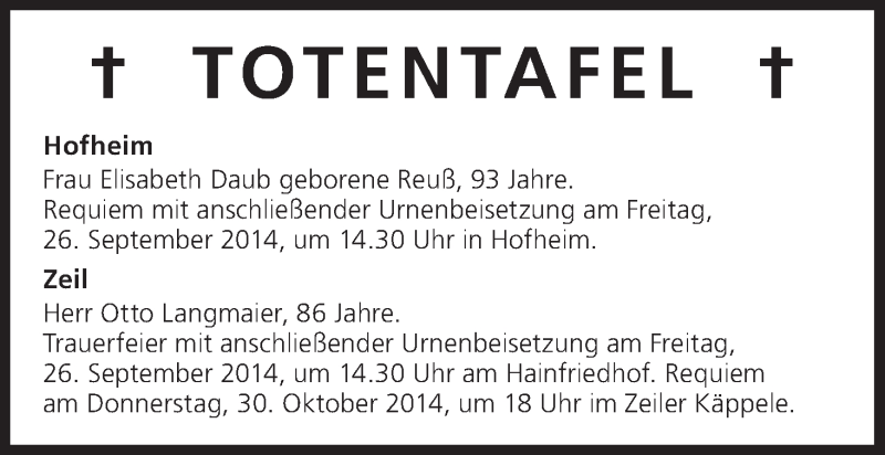 Totentafel vom 25.09.2014
