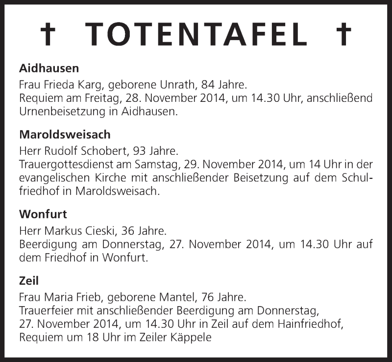 Hier finden Sie alle Traueranzeigen aus der Zeitung, die bisher für Totentafel vom 26-11-2014 erschienen sind. Weitere Traueranzeigen, die in der Zeitung erscheinen, werden hier ebenfalls aufgelistet