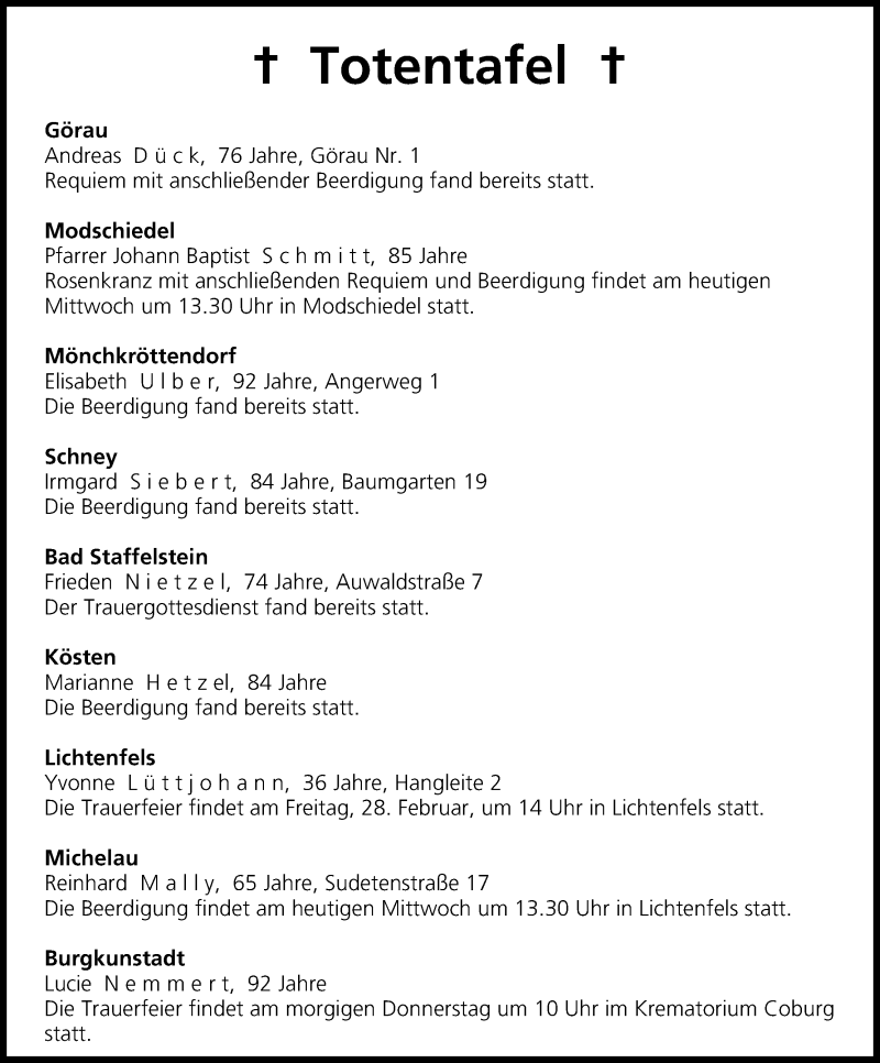 Hier finden Sie alle Traueranzeigen aus der Zeitung, die bisher für Totentafel vom 26.02.2014 erschienen sind. Weitere Traueranzeigen, die in der Zeitung erscheinen, werden hier ebenfalls aufgelistet