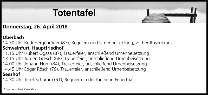 Hier finden Sie alle Traueranzeigen aus der Zeitung, die bisher für Totentafel vom 26.04.2018 erschienen sind. Weitere Traueranzeigen, die in der Zeitung erscheinen, werden hier ebenfalls aufgelistet