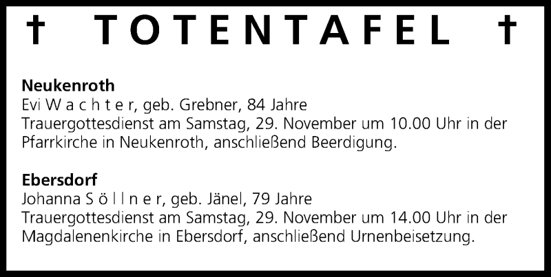Hier finden Sie alle Traueranzeigen aus der Zeitung, die bisher für Totentafel vom 28.11.2014 erschienen sind. Weitere Traueranzeigen, die in der Zeitung erscheinen, werden hier ebenfalls aufgelistet