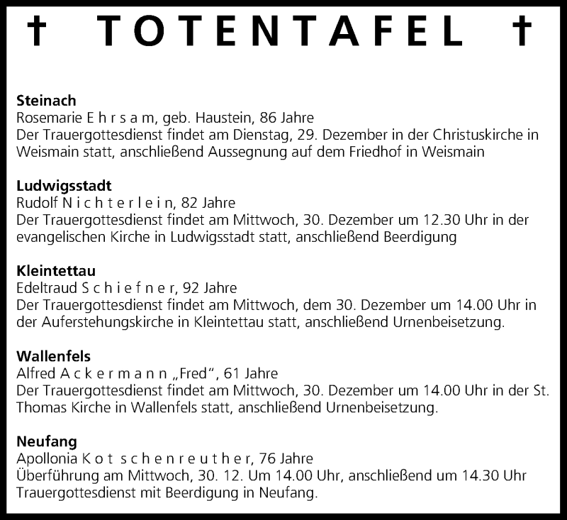 Hier finden Sie alle Traueranzeigen aus der Zeitung, die bisher für Totentafel vom 29.12.2015 erschienen sind. Weitere Traueranzeigen, die in der Zeitung erscheinen, werden hier ebenfalls aufgelistet