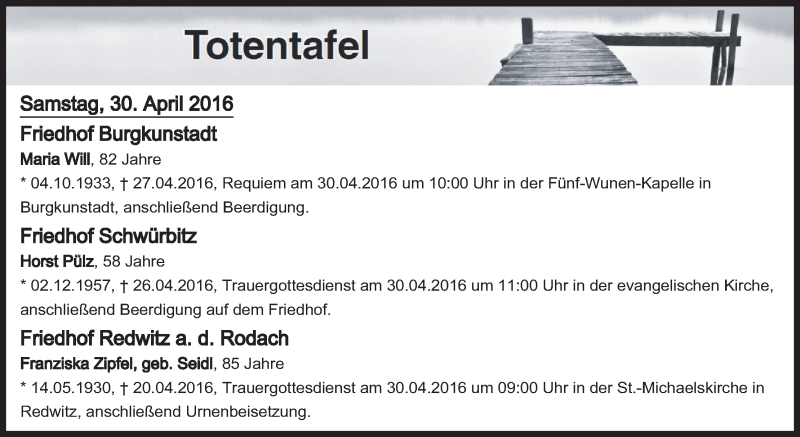 Hier finden Sie alle Traueranzeigen aus der Zeitung, die bisher für Totentafel vom 30.04.2016 erschienen sind. Weitere Traueranzeigen, die in der Zeitung erscheinen, werden hier ebenfalls aufgelistet