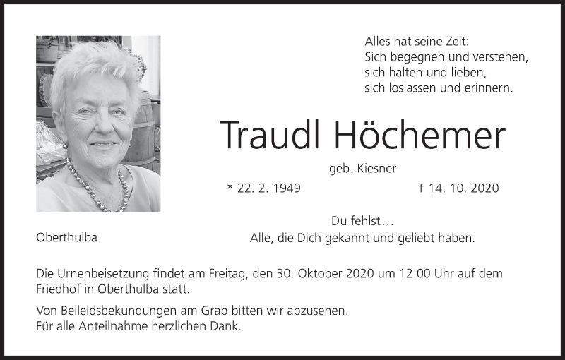 Hier finden Sie alle Traueranzeigen aus der Zeitung, die bisher für Traudl Höchemer erschienen sind. Weitere Traueranzeigen, die in der Zeitung erscheinen, werden hier ebenfalls aufgelistet