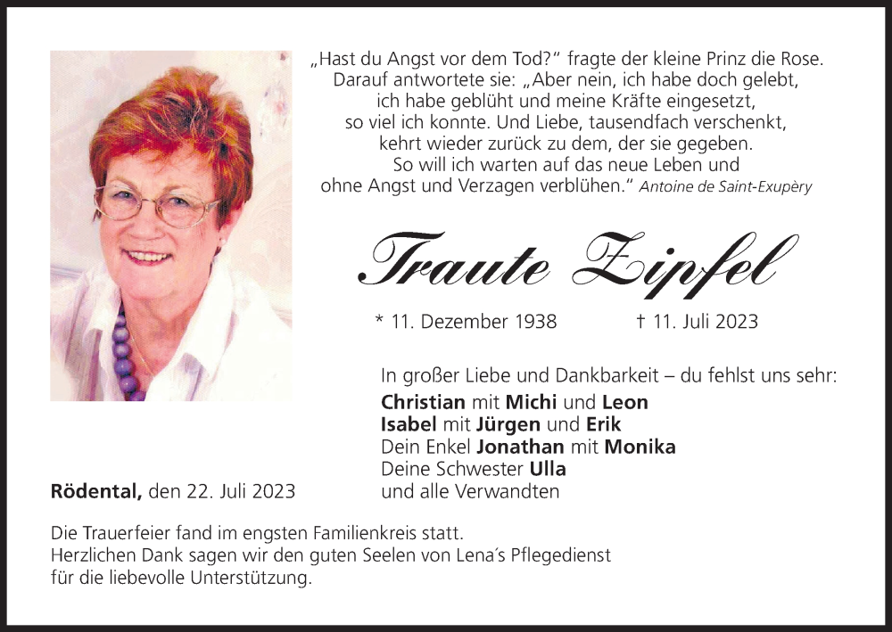 Hier finden Sie alle Traueranzeigen aus der Zeitung, die bisher für Traute Zipfel erschienen sind. Weitere Traueranzeigen, die in der Zeitung erscheinen, werden hier ebenfalls aufgelistet