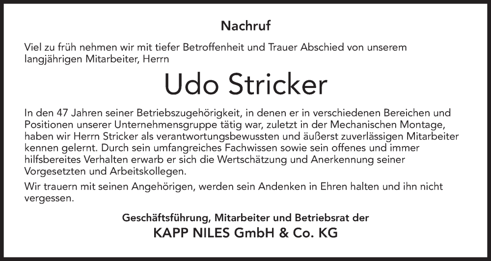 Hier finden Sie alle Traueranzeigen aus der Zeitung, die bisher für Udo Stricker erschienen sind. Weitere Traueranzeigen, die in der Zeitung erscheinen, werden hier ebenfalls aufgelistet