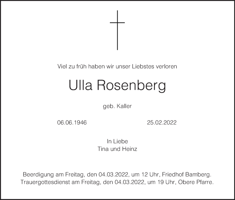 Hier finden Sie alle Traueranzeigen aus der Zeitung, die bisher für Ulla Rosenberg erschienen sind. Weitere Traueranzeigen, die in der Zeitung erscheinen, werden hier ebenfalls aufgelistet