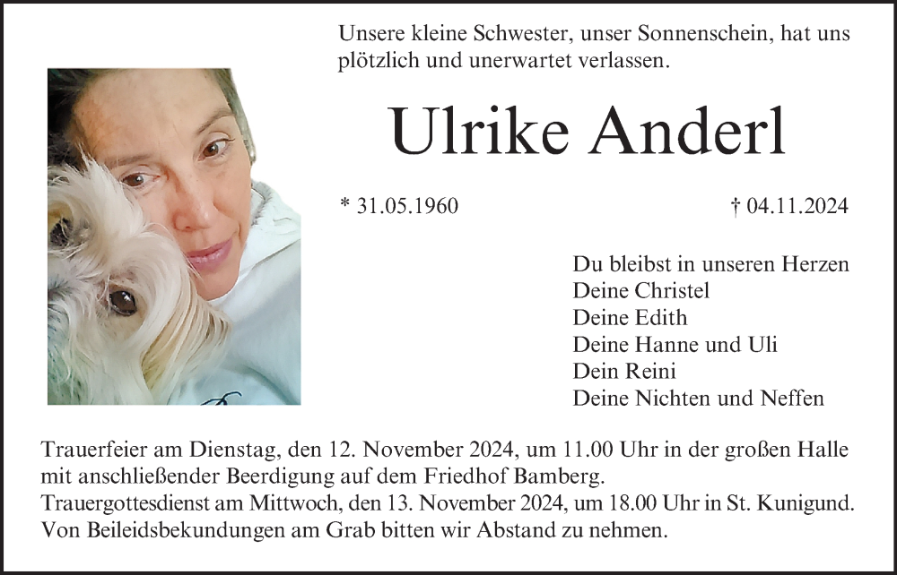 Hier finden Sie alle Traueranzeigen aus der Zeitung, die bisher für Ulrike Anderl erschienen sind. Weitere Traueranzeigen, die in der Zeitung erscheinen, werden hier ebenfalls aufgelistet