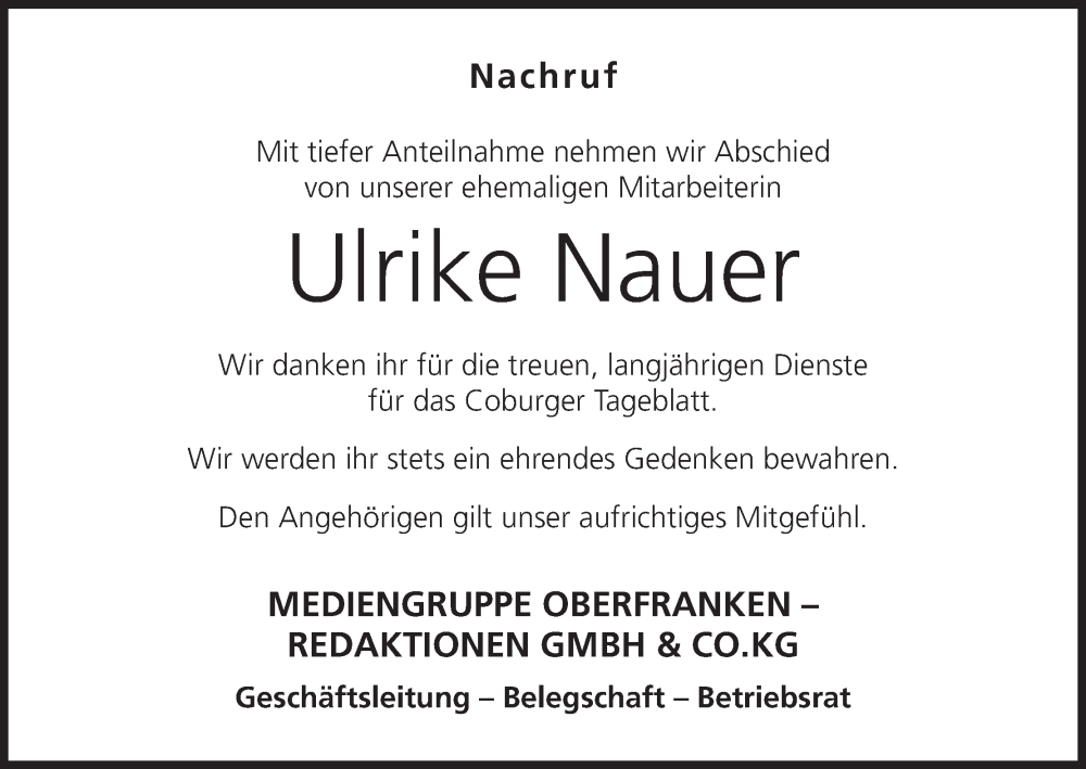 Hier finden Sie alle Traueranzeigen aus der Zeitung, die bisher für Ulrike Nauer erschienen sind. Weitere Traueranzeigen, die in der Zeitung erscheinen, werden hier ebenfalls aufgelistet