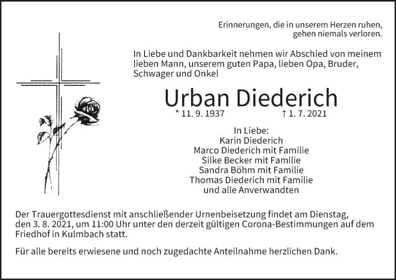 Hier finden Sie alle Traueranzeigen aus der Zeitung, die bisher für Urban Diederich erschienen sind. Weitere Traueranzeigen, die in der Zeitung erscheinen, werden hier ebenfalls aufgelistet