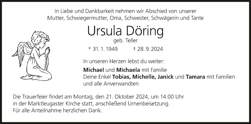 Hier finden Sie alle Traueranzeigen aus der Zeitung, die bisher für Ursula Döring erschienen sind. Weitere Traueranzeigen, die in der Zeitung erscheinen, werden hier ebenfalls aufgelistet