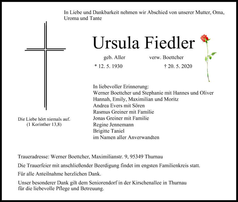 Hier finden Sie alle Traueranzeigen aus der Zeitung, die bisher für Ursula Fiedler erschienen sind. Weitere Traueranzeigen, die in der Zeitung erscheinen, werden hier ebenfalls aufgelistet