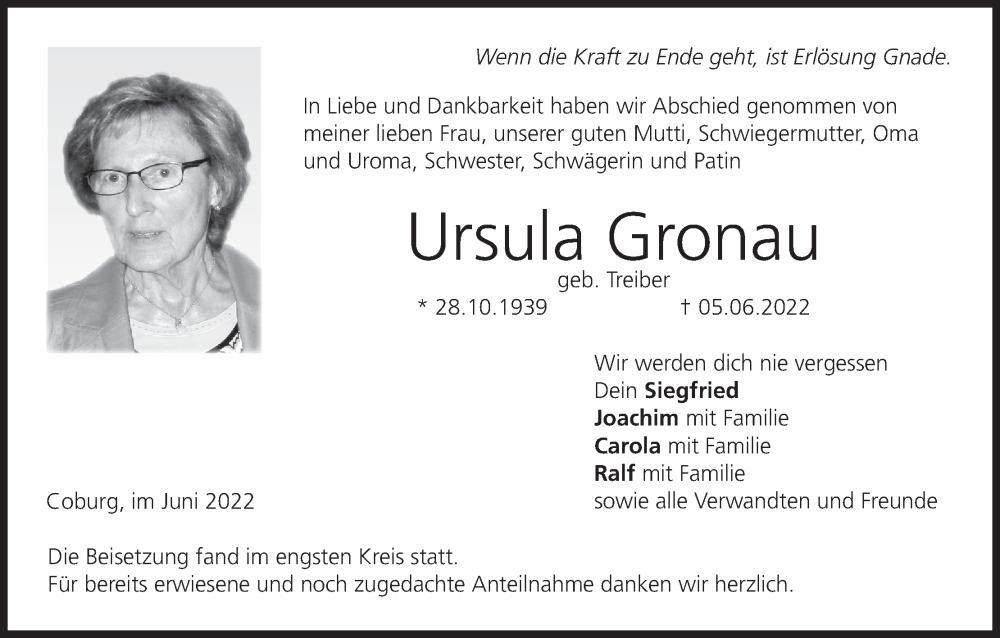 Hier finden Sie alle Traueranzeigen aus der Zeitung, die bisher für Ursula Gronau erschienen sind. Weitere Traueranzeigen, die in der Zeitung erscheinen, werden hier ebenfalls aufgelistet