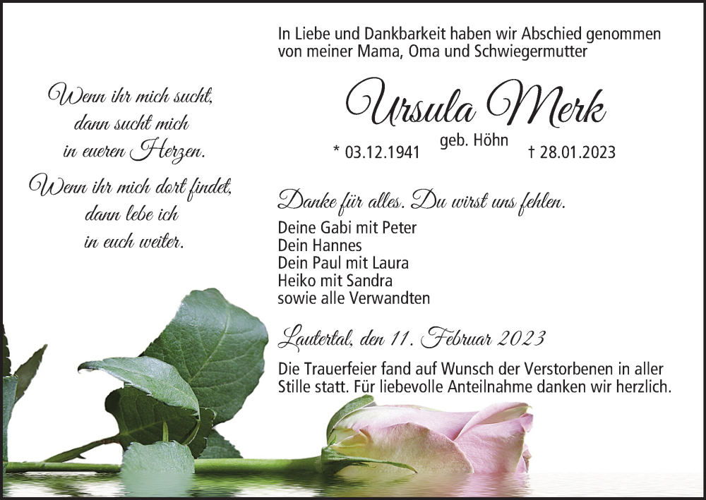 Hier finden Sie alle Traueranzeigen aus der Zeitung, die bisher für Ursula Merk erschienen sind. Weitere Traueranzeigen, die in der Zeitung erscheinen, werden hier ebenfalls aufgelistet