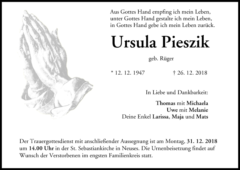 Hier finden Sie alle Traueranzeigen aus der Zeitung, die bisher für Ursula Pieszik erschienen sind. Weitere Traueranzeigen, die in der Zeitung erscheinen, werden hier ebenfalls aufgelistet