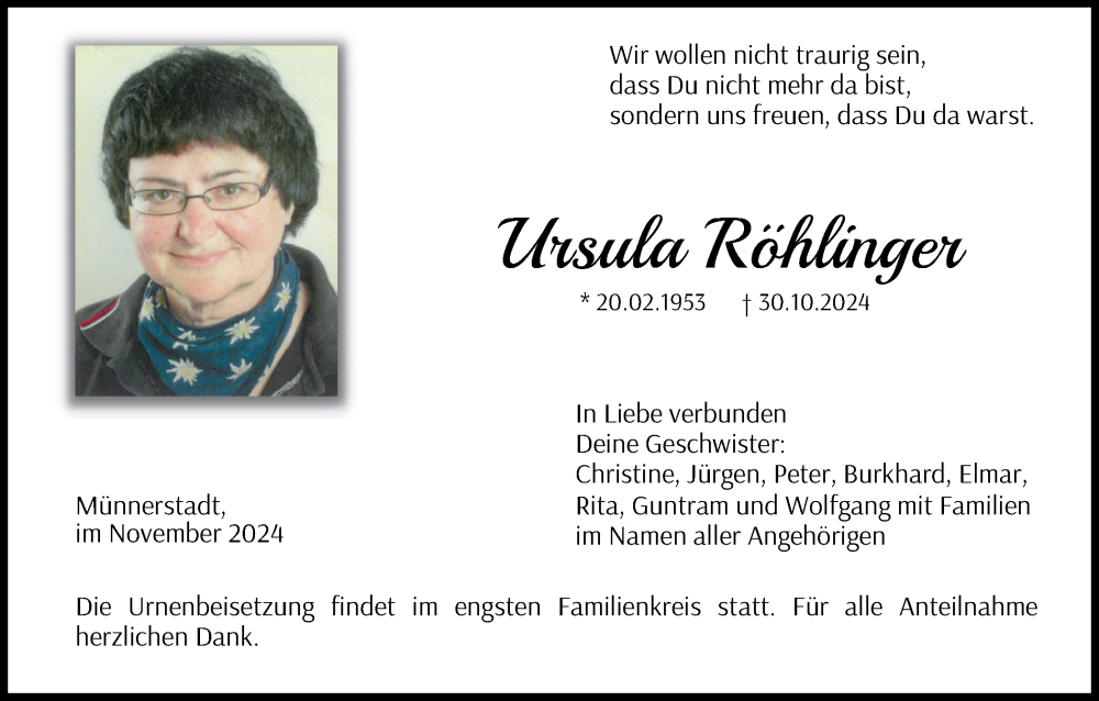 Hier finden Sie alle Traueranzeigen aus der Zeitung, die bisher für Ursula Röhlinger erschienen sind. Weitere Traueranzeigen, die in der Zeitung erscheinen, werden hier ebenfalls aufgelistet