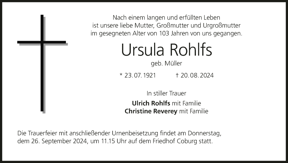 Hier finden Sie alle Traueranzeigen aus der Zeitung, die bisher für Ursula Rohlfs erschienen sind. Weitere Traueranzeigen, die in der Zeitung erscheinen, werden hier ebenfalls aufgelistet