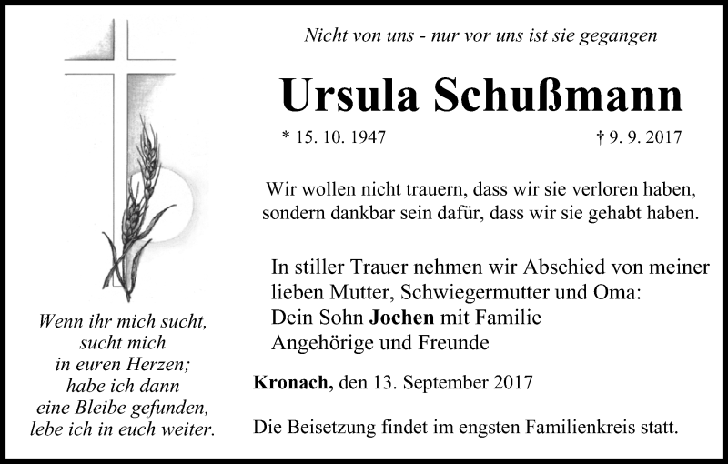 Hier finden Sie alle Traueranzeigen aus der Zeitung, die bisher für Ursula Schußmann erschienen sind. Weitere Traueranzeigen, die in der Zeitung erscheinen, werden hier ebenfalls aufgelistet