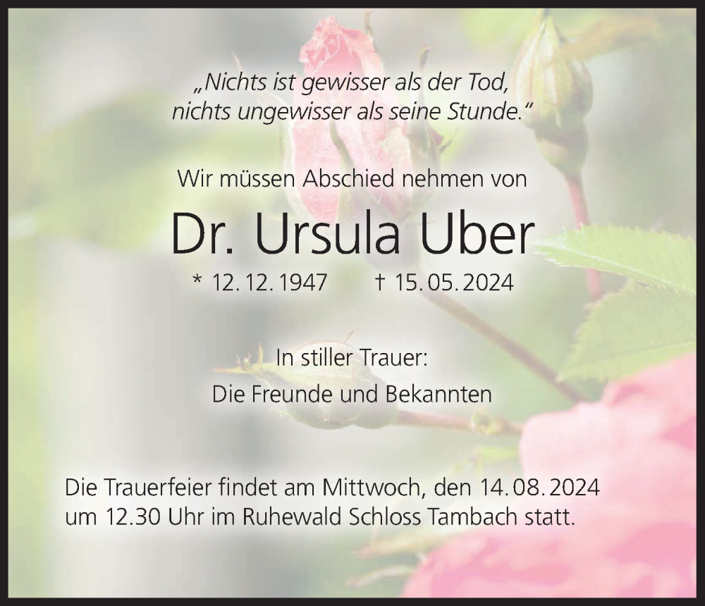 Hier finden Sie alle Traueranzeigen aus der Zeitung, die bisher für Ursula Uber erschienen sind. Weitere Traueranzeigen, die in der Zeitung erscheinen, werden hier ebenfalls aufgelistet