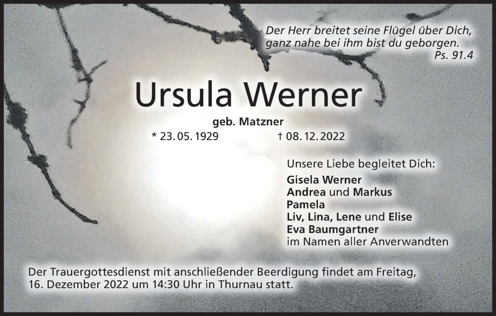 Hier finden Sie alle Traueranzeigen aus der Zeitung, die bisher für Ursula Werner erschienen sind. Weitere Traueranzeigen, die in der Zeitung erscheinen, werden hier ebenfalls aufgelistet