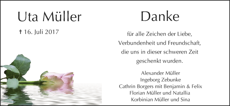 Hier finden Sie alle Traueranzeigen aus der Zeitung, die bisher für Uta Müller erschienen sind. Weitere Traueranzeigen, die in der Zeitung erscheinen, werden hier ebenfalls aufgelistet