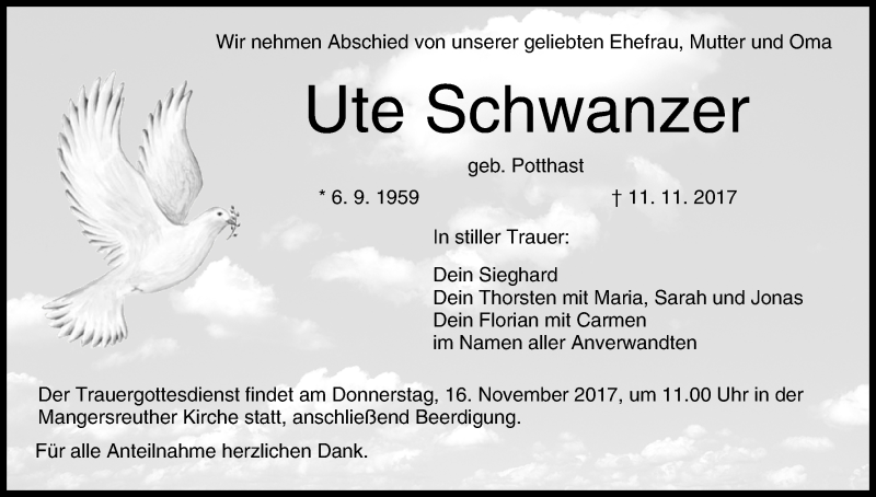 Hier finden Sie alle Traueranzeigen aus der Zeitung, die bisher für Ute Schwanzer erschienen sind. Weitere Traueranzeigen, die in der Zeitung erscheinen, werden hier ebenfalls aufgelistet