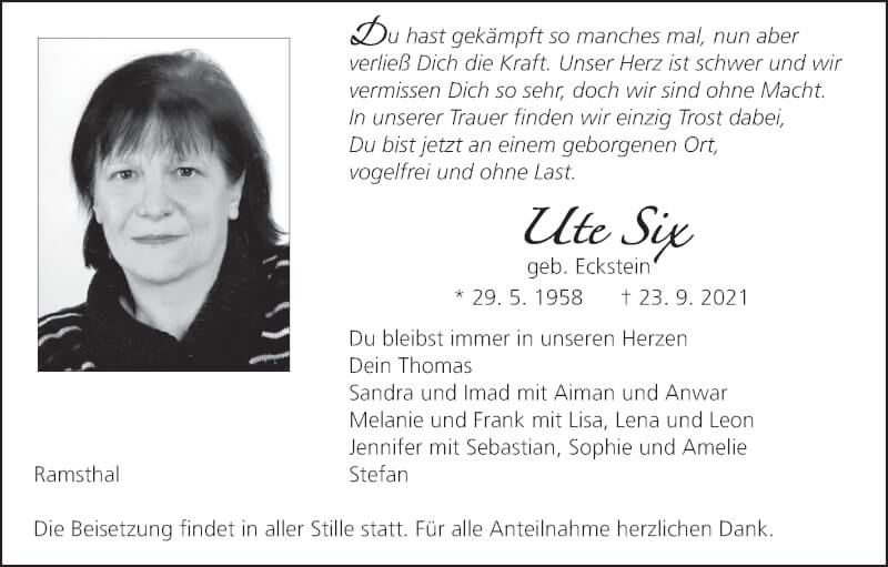Hier finden Sie alle Traueranzeigen aus der Zeitung, die bisher für Ute Six erschienen sind. Weitere Traueranzeigen, die in der Zeitung erscheinen, werden hier ebenfalls aufgelistet