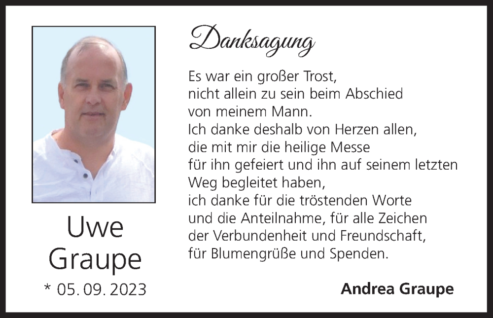 Hier finden Sie alle Traueranzeigen aus der Zeitung, die bisher für Uwe Graupe erschienen sind. Weitere Traueranzeigen, die in der Zeitung erscheinen, werden hier ebenfalls aufgelistet