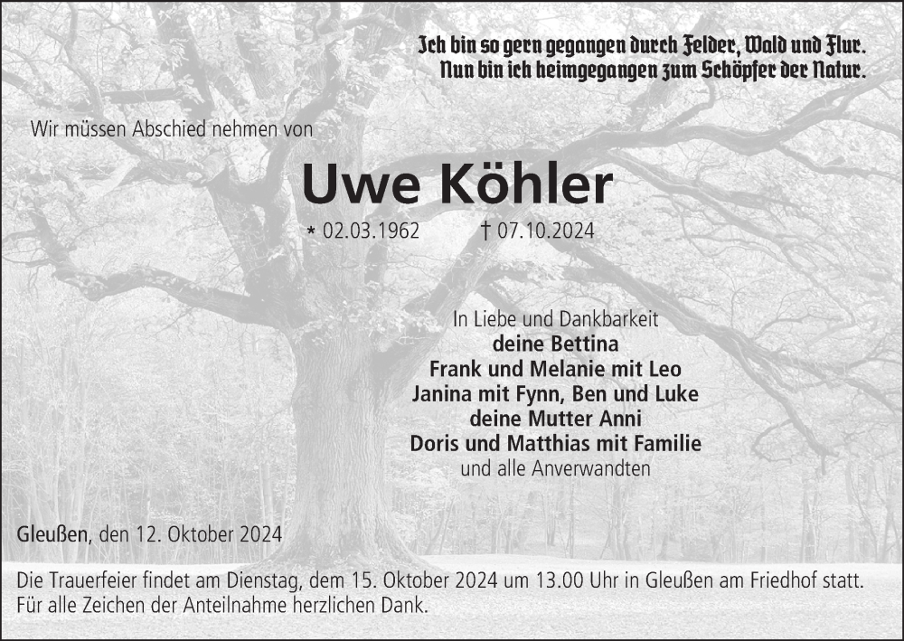 Hier finden Sie alle Traueranzeigen aus der Zeitung, die bisher für Uwe Köhler erschienen sind. Weitere Traueranzeigen, die in der Zeitung erscheinen, werden hier ebenfalls aufgelistet