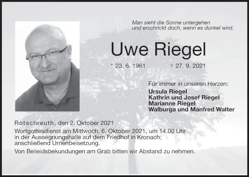 Hier finden Sie alle Traueranzeigen aus der Zeitung, die bisher für Uwe Riegel erschienen sind. Weitere Traueranzeigen, die in der Zeitung erscheinen, werden hier ebenfalls aufgelistet
