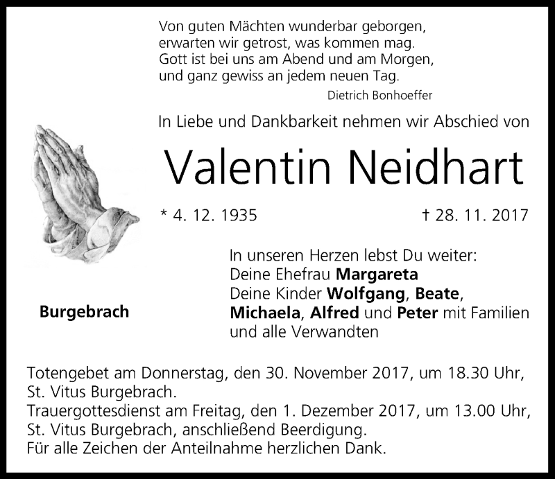 Hier finden Sie alle Traueranzeigen aus der Zeitung, die bisher für Valentin Neidhart erschienen sind. Weitere Traueranzeigen, die in der Zeitung erscheinen, werden hier ebenfalls aufgelistet