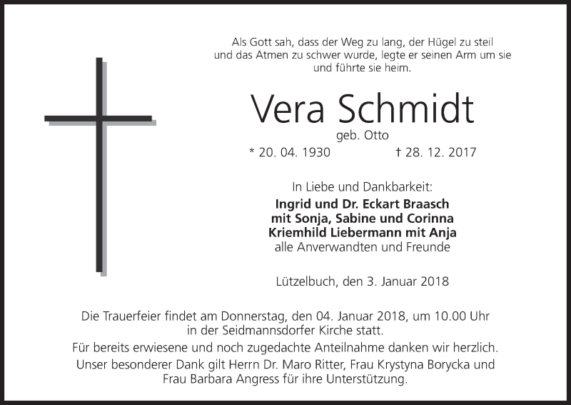 Hier finden Sie alle Traueranzeigen aus der Zeitung, die bisher für Vera Schmidt erschienen sind. Weitere Traueranzeigen, die in der Zeitung erscheinen, werden hier ebenfalls aufgelistet