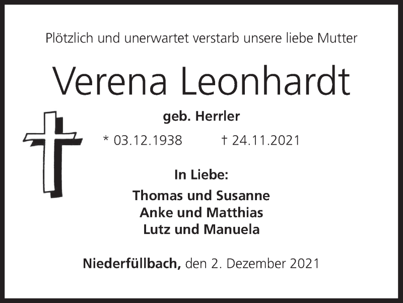 Hier finden Sie alle Traueranzeigen aus der Zeitung, die bisher für Verena Leonhardt erschienen sind. Weitere Traueranzeigen, die in der Zeitung erscheinen, werden hier ebenfalls aufgelistet