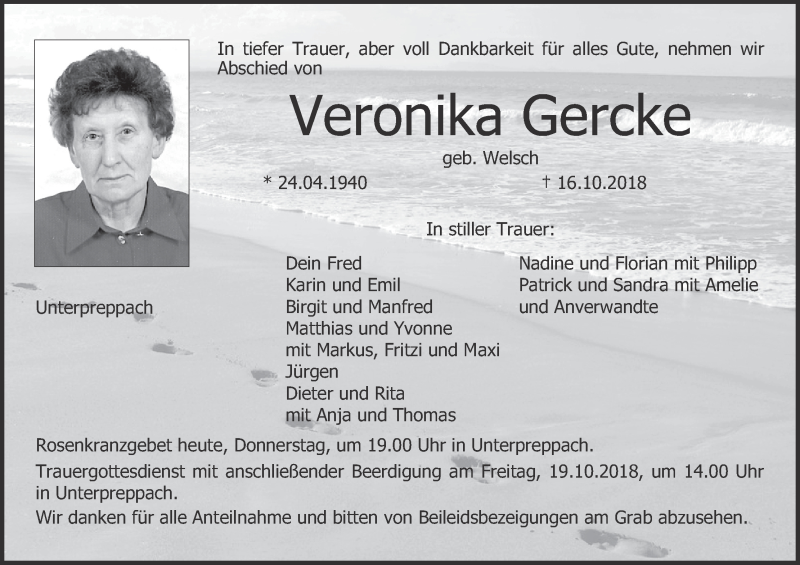 Hier finden Sie alle Traueranzeigen aus der Zeitung, die bisher für Veronika Gercke erschienen sind. Weitere Traueranzeigen, die in der Zeitung erscheinen, werden hier ebenfalls aufgelistet