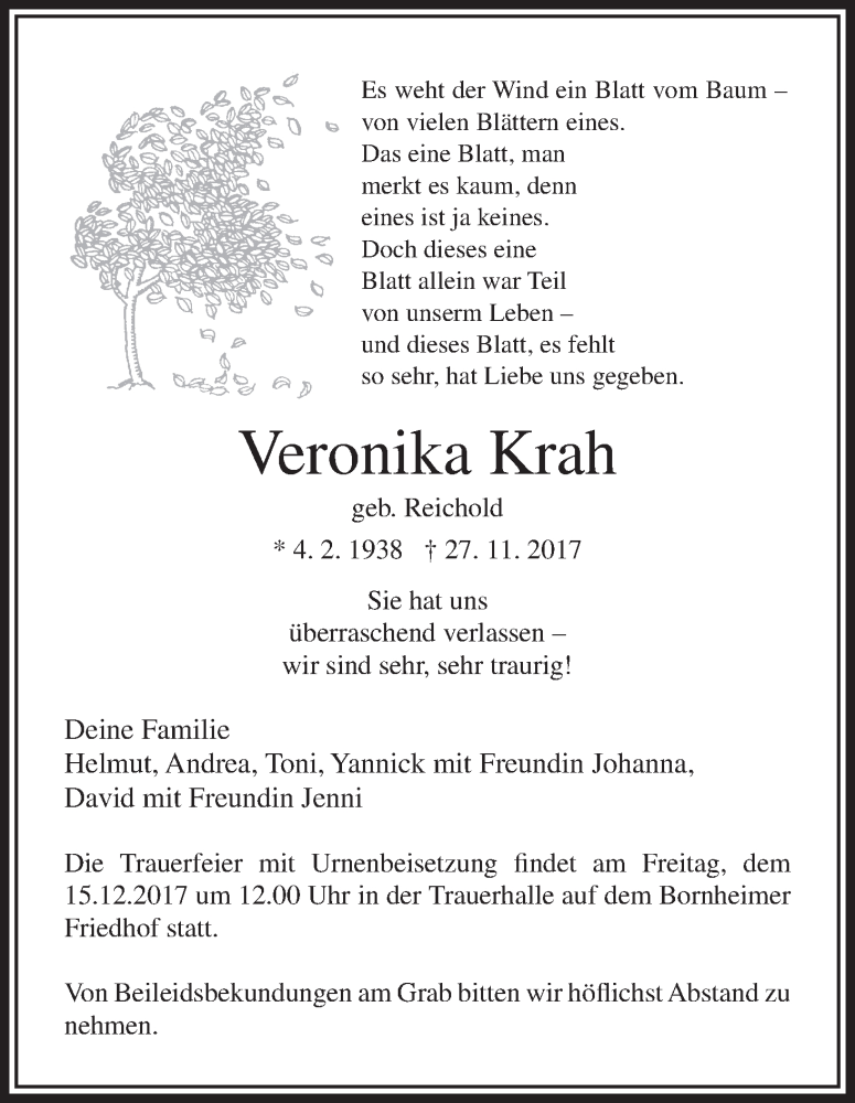 Hier finden Sie alle Traueranzeigen aus der Zeitung, die bisher für Veronika Krah erschienen sind. Weitere Traueranzeigen, die in der Zeitung erscheinen, werden hier ebenfalls aufgelistet