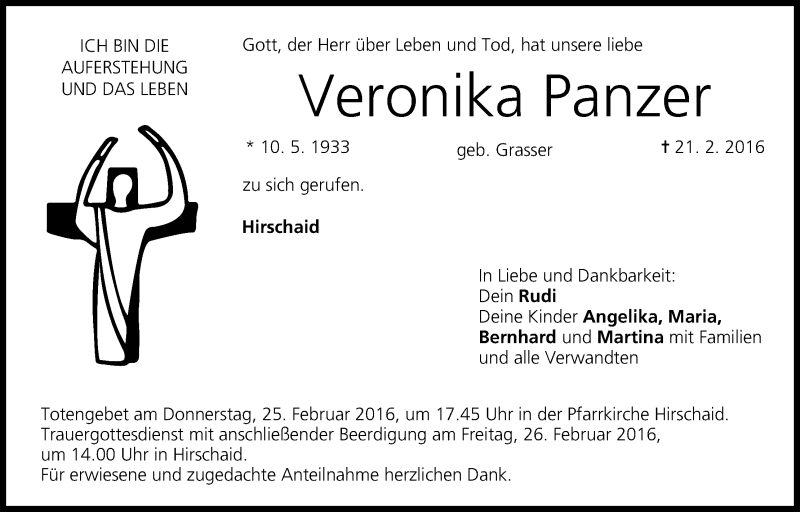 Hier finden Sie alle Traueranzeigen aus der Zeitung, die bisher für Veronika Panzer erschienen sind. Weitere Traueranzeigen, die in der Zeitung erscheinen, werden hier ebenfalls aufgelistet